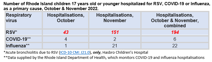 With the cooperation of Rhode Island Department of Health (RIDOH) spokesman Joseph Wendelken, and an academic paediatrician at Hasbro Children’s Hospital, I can now present those hospitalisation data, per the table below. Given time lags in compilation and transmission, the hospitalisation record only covers all of October, and November 2022.