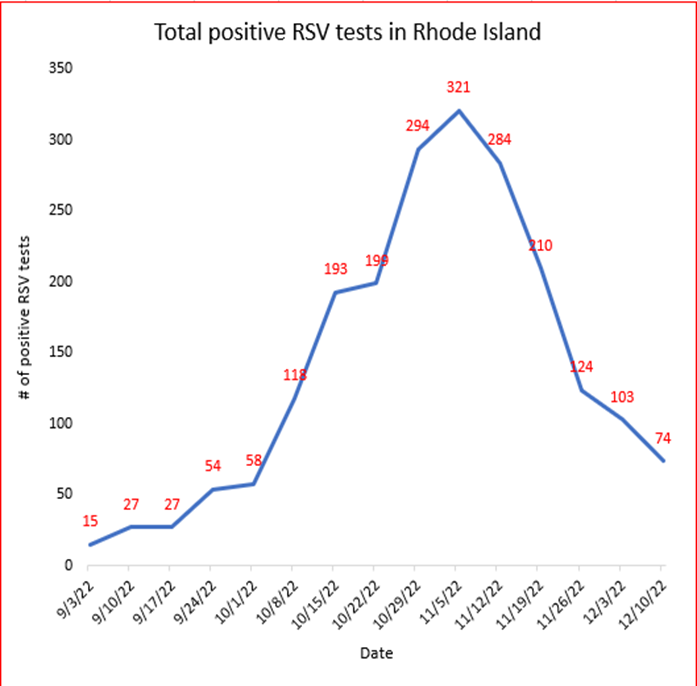 Present ‘tripledemic’ nonoccurrence aside, the overwhelmingly RSV-driven rate of increased paediatric respiratory illness hospitalisations in Rhode Island during October and November should decline significantly in December and January as RSV infection rates peaked in early November and declined precipitously through early December (see data from RIDOH, plotted below).