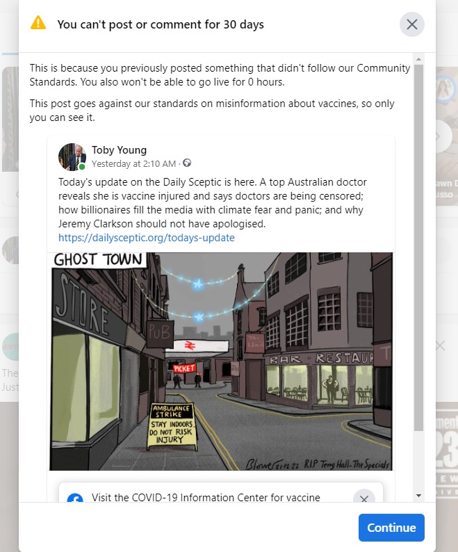 We’ve suffered similar problems with various social media platforms in the past year, seeing the Daily Sceptic’s accounts on Facebook and LinkedIn suspended for days, weeks or months at a time because, according to ‘independent fact-checkers’, the articles we were promoting contained ‘misinformation’ or worse. Thankfully, this kind of thing no longer happens on Twitter, but it still happens on Facebook. Indeed, we received a notification from Facebook yesterday that my personal account had been suspended for 30 days because I’d published a “post that goes against our standards on misinformation about vaccines”.