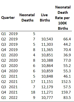 What are the chances that those spikes are just a fluke? A statistical test called Chi-square can help us compare an average quarter to one of the quarters with a big spike. If we look at the average number of neonatal deaths per quarter in 2019-2020 (which is 6) and the average number births (which is 10,882) and compare that with either the second quarter or fourth quarter of 2021, the result is statistically significant: for the second quarter, you would expect that number of neonatal deaths or more about 2.5 times out of a hundred; for the fourth quarter you’d expect that number 1.8 times out of a hundred. (Anything less than 5 times out of a hundred is considered statistically significant according to conventional standards.)
