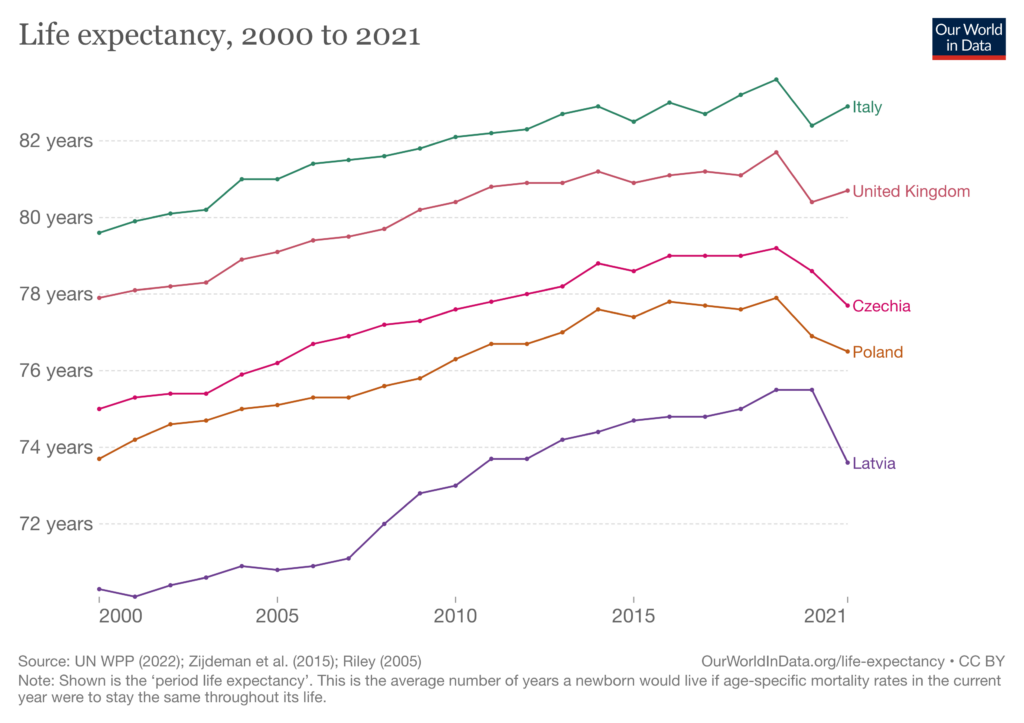 Consider the chart below, which show life expectancy in selected European countries from 2000 to 2021.