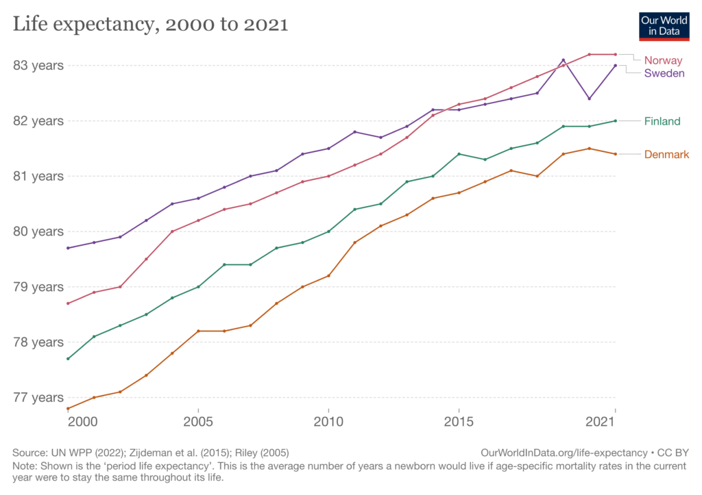 We can also compare Sweden to the other Nordic countries, as in the chart below. The first thing to notice is that even in 2020, when Swedes supposedly faced “disaster”, they actually lived longer than both Danes and Finns. At the height of the pandemic, Swedish life expectancy was 82.4, compared to ‘only’ 81.5 in Denmark.