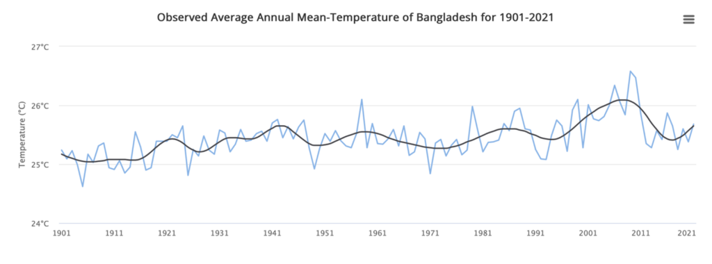 According to figures compiled for the World Bank, the average temperature in Bangladesh is the same today as it was 100 years ago. There are the usual cyclical changes, but global warming is not much in evidence around the Bay of Bengal.