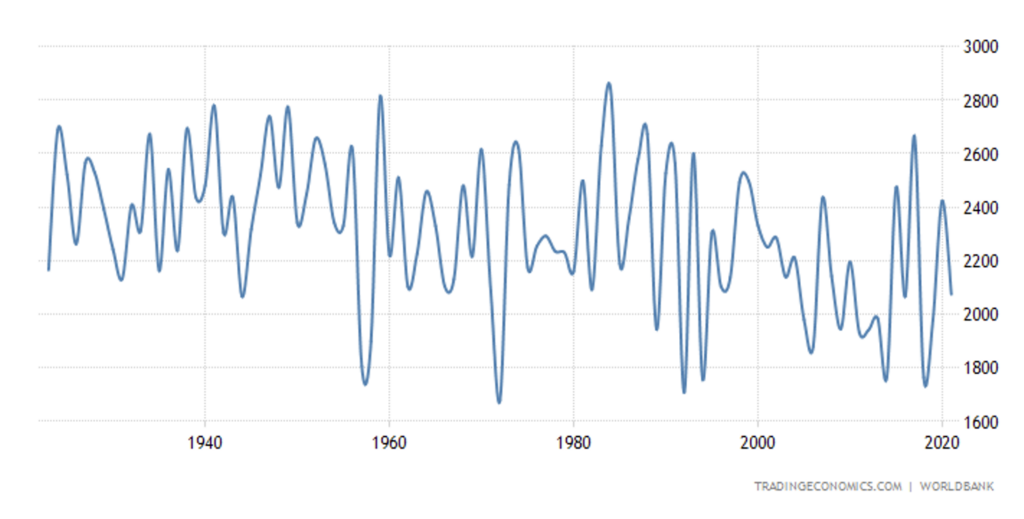 Again according to the World Bank, we see little change in the overall trend going back 100 years. If anything, rainfall has slightly decreased, and there‘s certainly nothing unusual in the recent past. The graph shows that rainfall can vary widely between years. Severe monsoons in the past have caused enormous damage and heavy loss of life. Six catastrophic floods were recorded in the 19th century and 18 in the 20th. These days, hundreds of people can die in the flooding; in the past the figures could run into hundreds of thousands.