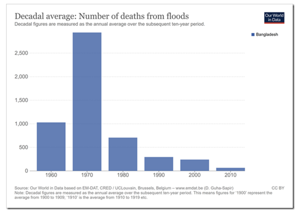 As countries become more prosperous, they can become more resilient in the face of what nature has always thrown at them. This appears to have happened in the case of Bangladesh, where the number of fatalities from flooding has significantly declined over the last 50 years. Surely, this is the good news story that should be spread in mainstream media, and probably would be if the climate change narrative was not embedded in every part of the discourse.