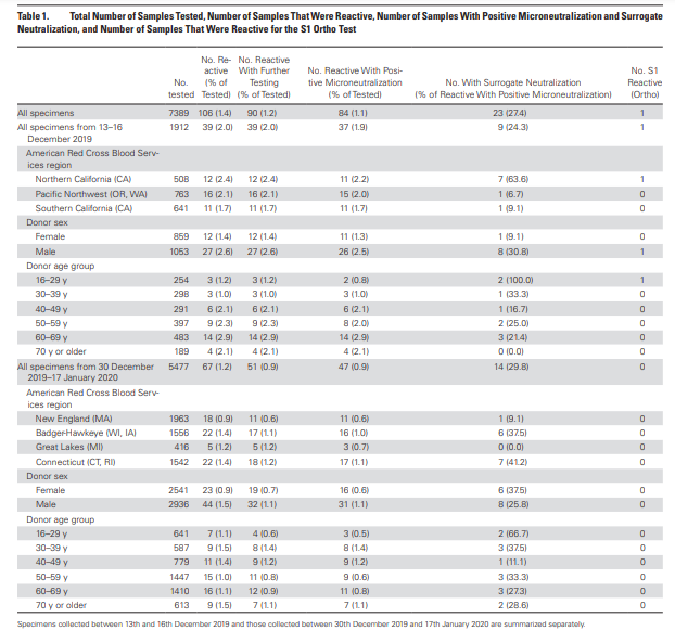 An antibody study of archived Red Cross blood conducted by the U.S. CDC found 39 antibody-positive serum samples collected December 13th-16th 2019 in California, Washington and Oregon. Overall, 2% of blood samples collected from these states on these dates tested positive for antibodies. The full results can be viewed in the table below. A 2% antibody prevalence in mid-December suggests significant community spread across America during November 2019. However, there were no earlier samples for comparison and no testing or sequencing of viral RNA for confirmation.