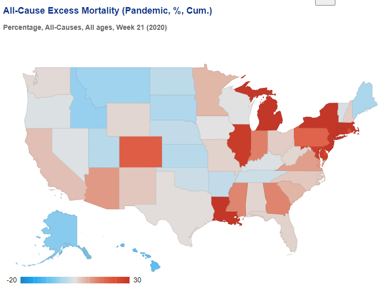 To illustrate, here’s the picture in the U.S. at the end of May 2020, after the initial wave. It’s a real patchwork, with clear concentrations of excess deaths around New York and around Michigan, Illinois and Indiana, plus Louisiana and one or two other states. Many other states had very few excess deaths during the spring. Yet we know the virus was circulating widely in every state.