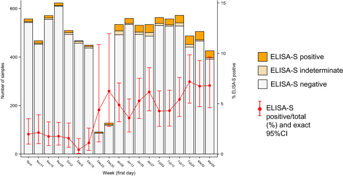 A study of stored blood samples in France examined hundreds of routinely collected samples in a population cohort and found around 2% prevalence of antibodies in November, rising prevalence in December and around 5% prevalence in January. These figures do seem on the high side when compared to the above studies, and the lack of testing and sequencing of viral RNA and the absence of samples from earlier periods suggest this may be less reliable evidence.