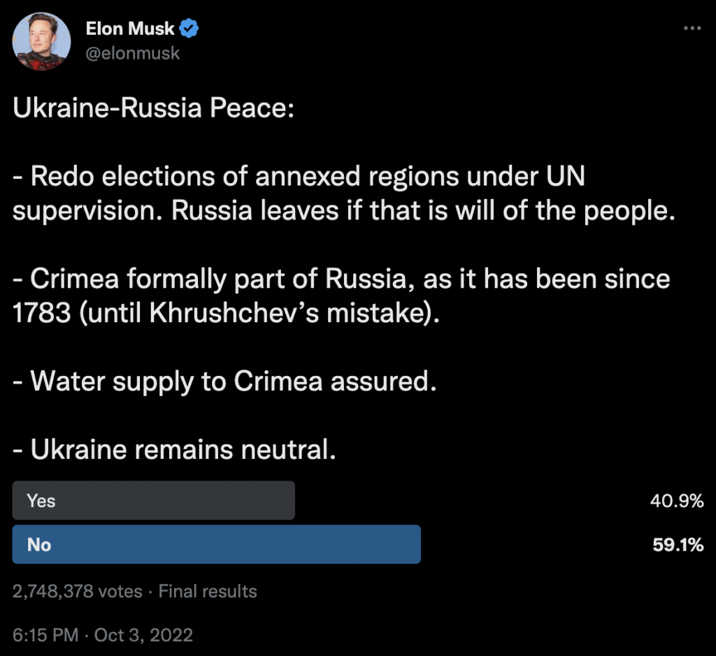 At the beginning of October, Elon Musk put forward a peace plan for Ukraine. The plan came, like so many of Musk’s ideas, in the form of a Twitter poll:
