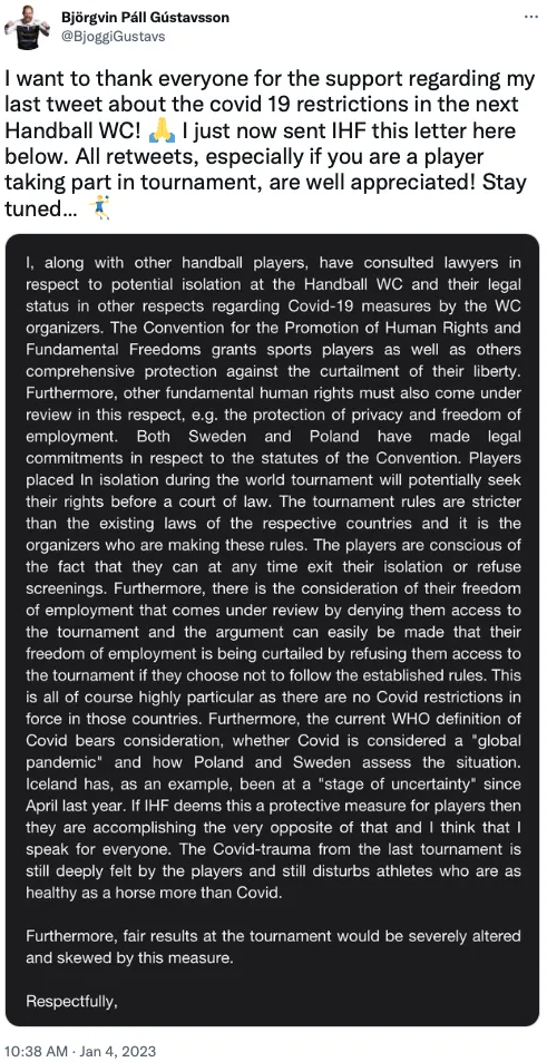 Is the International Handball Federation joking, asks Icelandic goalkeeper Björgvin Páll Gústavsson in a tweet on the Federation’s quarantine rules for the 2023 World Cup. Are you trying to destroy our sport?