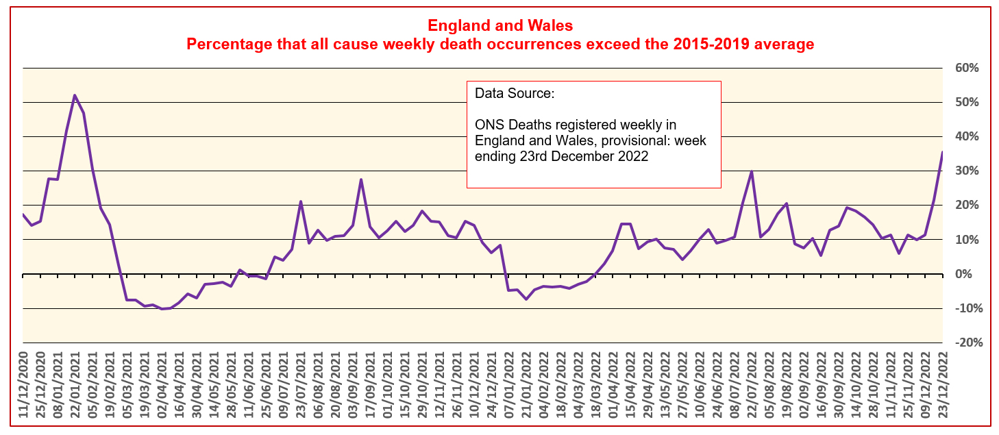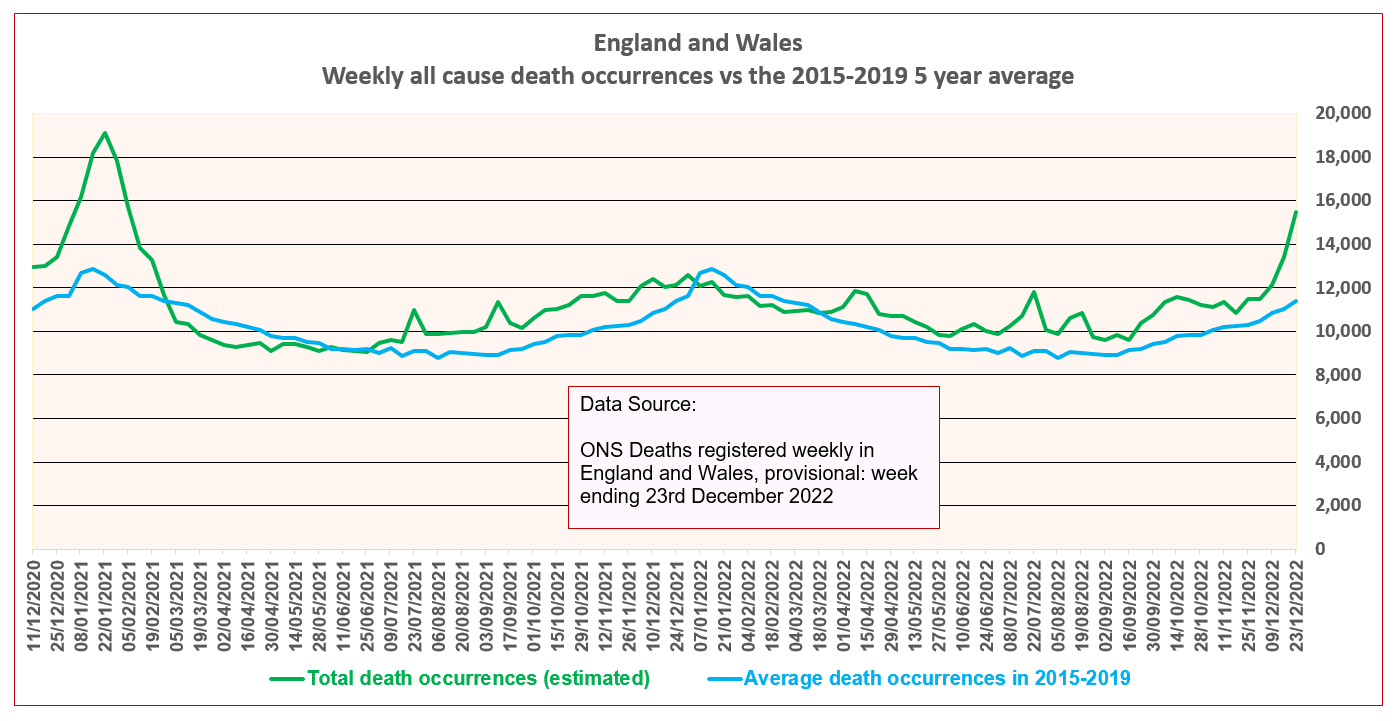 Looking at the death occurrence data looks like there has been a huge spike in all cause death occurrences in England and Wales over the 2 weeks ending 23rd December 2022.