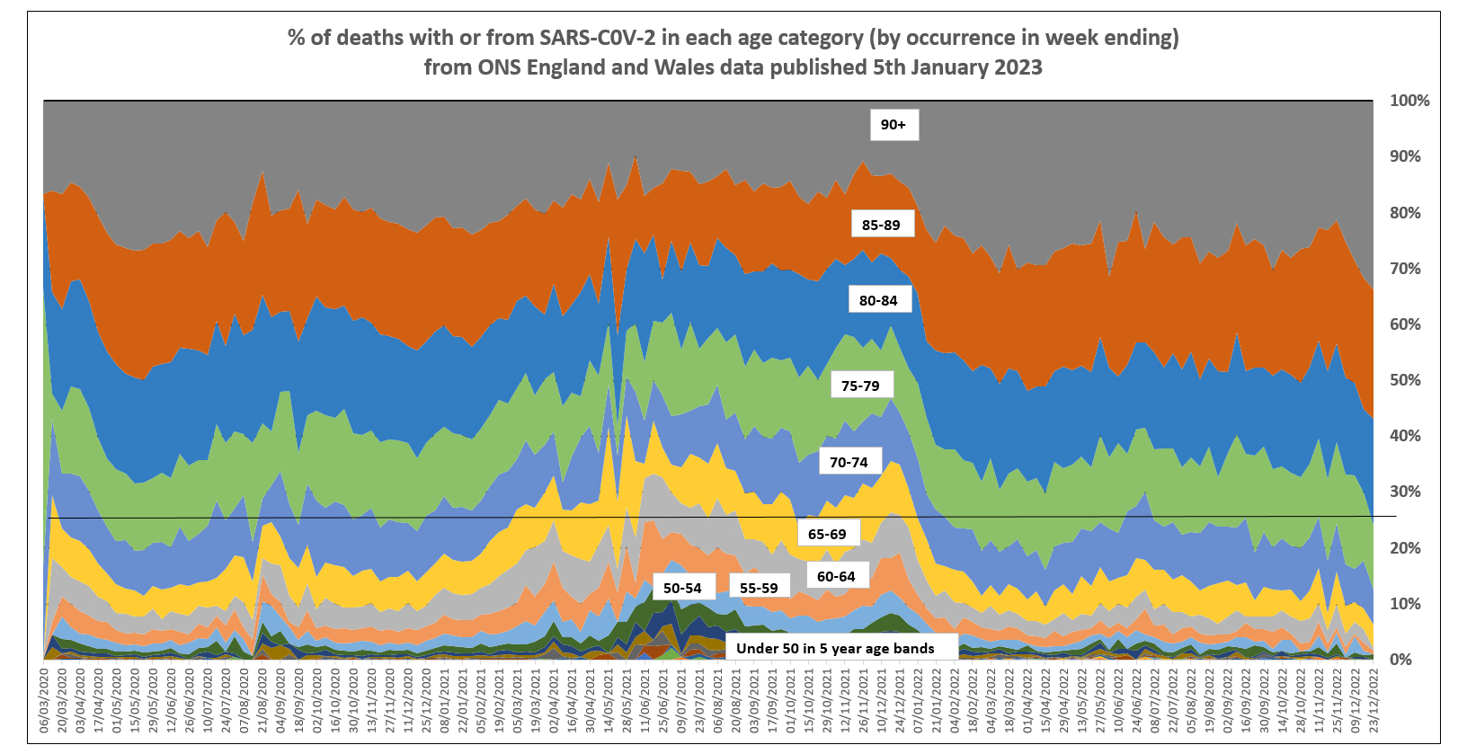 But that huge caveat aside, if you look at the age distribution of covid labelled deaths from the ONS data, it’s startling that the most boosted age groups form an increasing percentage of all such deaths. And the covid labelled deaths amongst younger people is impossible to see on the chart without x-ray eyesight. And yet the experimental vaccination continues.