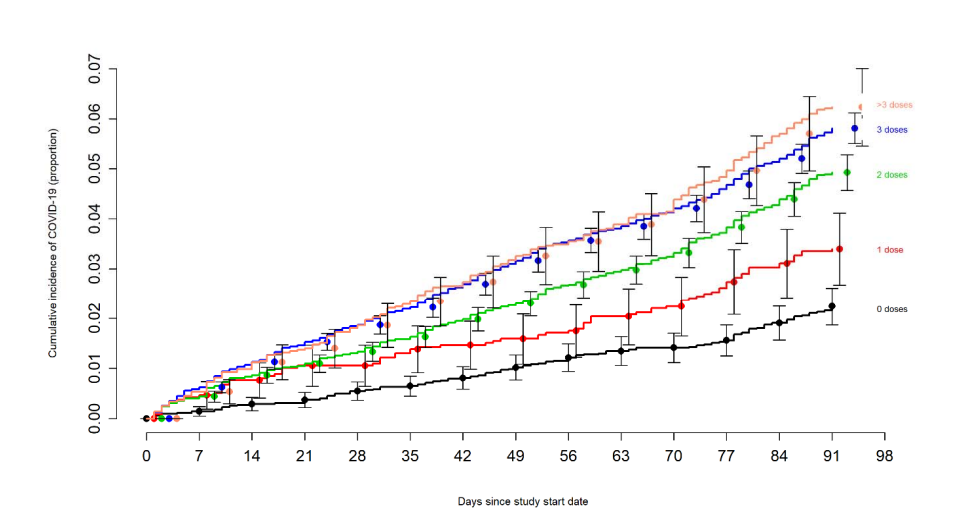 Businessman and mathematician Igor Chudov, reporting here on the NSW findings, acknowledges that the figures will be skewed by differences in how many people have had the different number of shots. After adjusting for those differences, however, he finds that the four-times-jabbed have a four times increased risk of hospitalisation compared with those who had two shots.