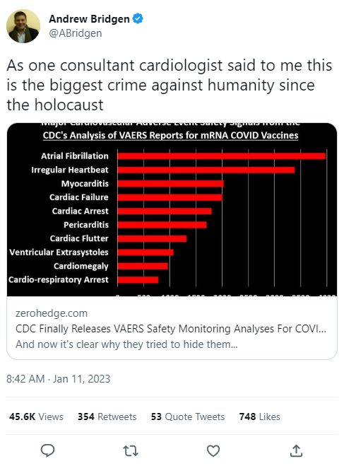 His ‘offensive’ comment came in a tweet (now deleted) on Wednesday morning linking to a write-up by Israeli academic Dr. Josh Guetzkow of the recently released CDC adverse event analysis, where Bridgen approvingly quotes an unnamed “consultant cardiologist” who he said had told him: “This is the biggest crime against humanity since the holocaust.”