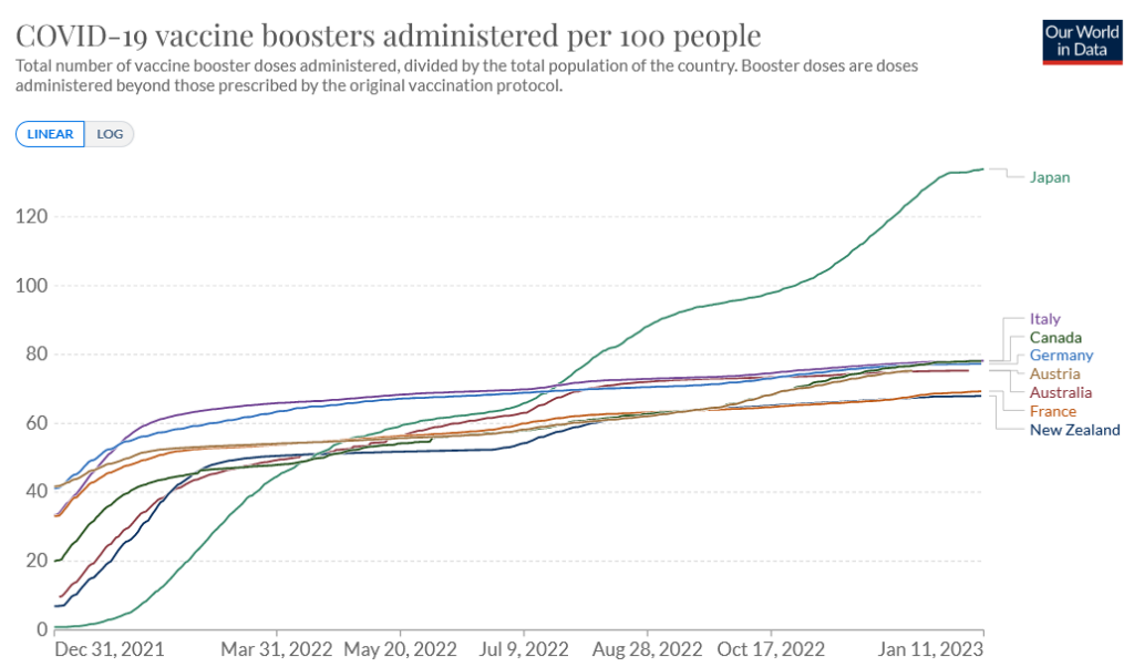 After three booster campaigns in 2022, the Japanese are now in a league of their own among mRNA consuming countries, administering far more boosters than countries that had far more coercive vaccination campaigns.