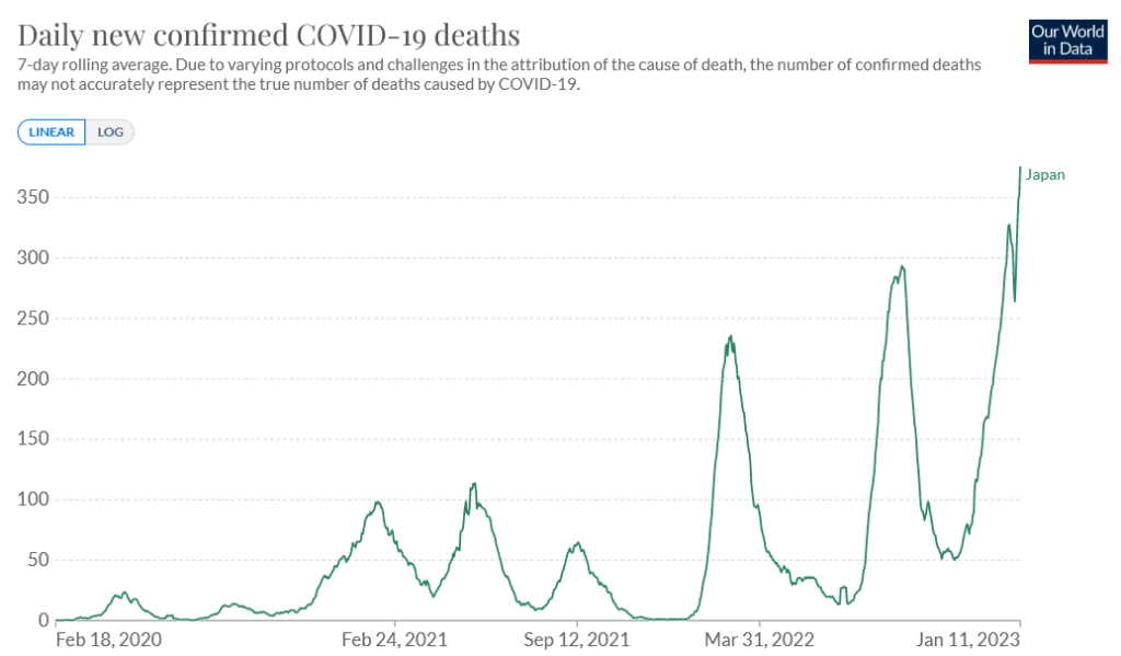 Japanese over-65s have done their best to reduce Japan’s 612-million-dose stockpile of mRNA jabs, with third, fourth and fifth jab rates of 91%, 82.5%, and 56%, respectively. But unfortunately, Japan has started 2023 by reporting its highest ever daily Covid death tolls. During the booster era starting in early 2022, each wave has been noticeably higher than the last.