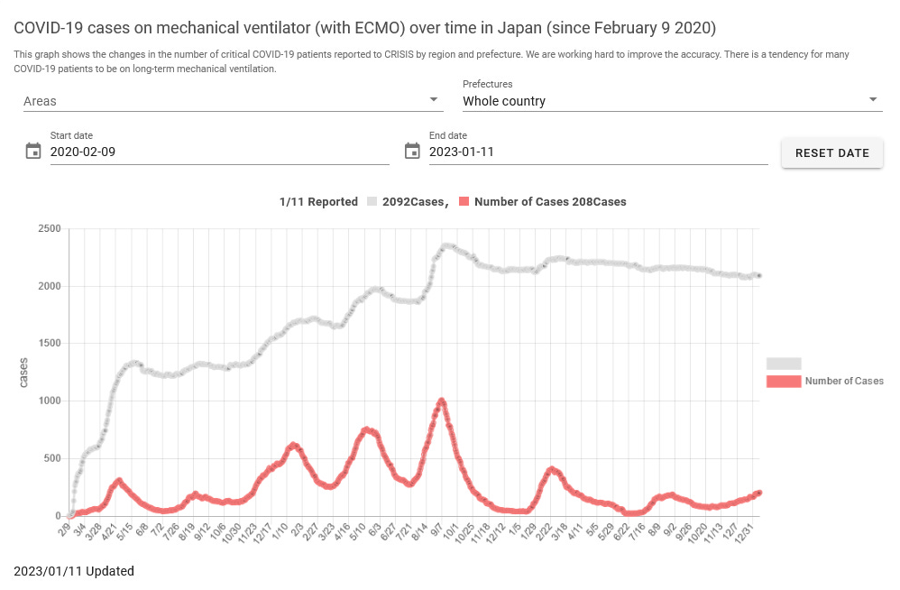 But although he’s three years late, Dr. Kamayachi has a point. Although reported Covid deaths have been much higher in the booster era, far fewer Covid cases have been receiving mechanical ventilation (the grey line shows the number of ventilators (with ECMO) secured for Covid patients).
