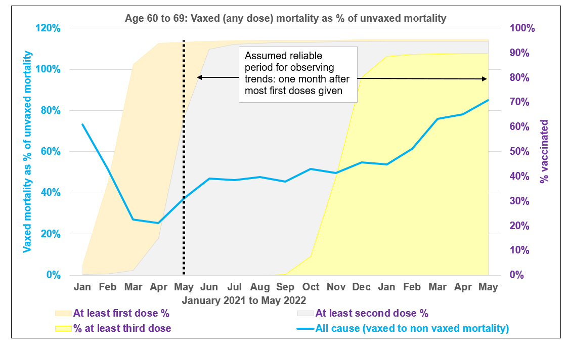 Yes. For example look at the ONS July dataset up to May 2022. There are problems with that dataset as detailed in Norman Fenton etal’s paper The likely errors in the ONS dataset in broad terms may amongst other things be a) errors in deaths that have occurred in the first few weeks after the experimental vaccine being recorded as unvaccinated deaths rather than vaccinated deaths. b) An understatement of the proportion unvaccinated in each age group that persists through to May 2022, after most first doses have been given. So you can’t look at absolute mortality rates in the vaxed and unvaxed because of these errors. But however looking at the trends in the ratio of vaxed mortality to unvaxed mortality over time, rather than the absolute values of the ratio of vaxed to unvaxed mortality, and by using vaxed (any dose) mortality rather than say second or third dose, and only looking at the trends for the period from roughly one month after most first doses have been given to May 2022 you can see what is happening The logic is that by looking at a period a month after most first doses have been given the misallocation of… Read more »