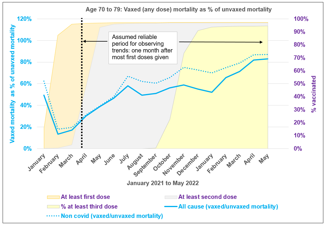 And in the 70-79 age group rising relative mortality in the vaxed (any dose) again