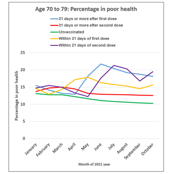 And incidentally the ONS claim the unvaxed are a select group with better health than the vaxed in the 70-79 age group (see their chart attached) and yet the unvaxed non covid mortality from their raw data is higher than non covid mortality in the vaxed up to October 2021 (from my previous chart). A clear contradiction, and a very strong indicator that the ONS percentage unvaccinated is understated and that the absolute ratios can’t be compared; only the trends can be compared.