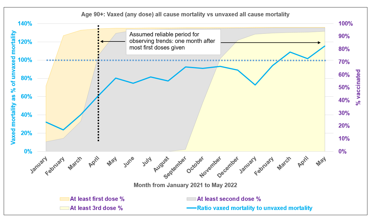 And in the 90+ age group we see similar trends of relative vaxed mortality (vs the unvaxed) increasing with subsequent doses. What’s more in this age group even using the raw ONS data the unvaxed 90+ category have lower absolute all cause mortality in March to May 2022 than the vaxed (any dose) and that’s without adjusting for the ONS likely understatement of the percentage unvaccinated!