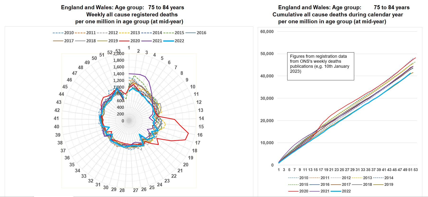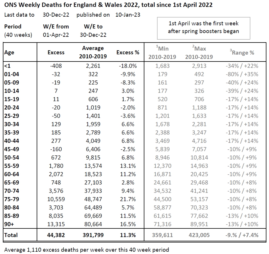 Among the stats that I calculate are the cumulative deaths in 2022 since 1st April 2022. This is when the spring booster was rolled out. Overall, there is an 11.3% increase in deaths over the average, population-corrected, mortality for the same period in 2010-2019. This is not age-corrected. How about looking at this age group by age group? It is consistently above average in most cases. Of course, the higher age groups contribute more towards the total, but one cannot deny the increase across the board. I also show the extreme maximum above average figures for 2010-2019. I call these ‘extreme’ because they take the individual weekly maxima rather that the year total. I could do some fancy work averaging groups of weeks out, but ‘extreme’ maxima will do for the moment. Overall, the ‘extreme’ maximum is 7.4%. 2022’s maximum is 50% above the 10 year maxima. I regard that as signficant. Note that, until the spring booster, deaths for 2022 were average. Because there was an upturn after this data, it prompted investigation. Using the complete year, it is 8.4% above average with a similarly consistent above average mortality in each age group. This would put 2022 on a… Read more »
