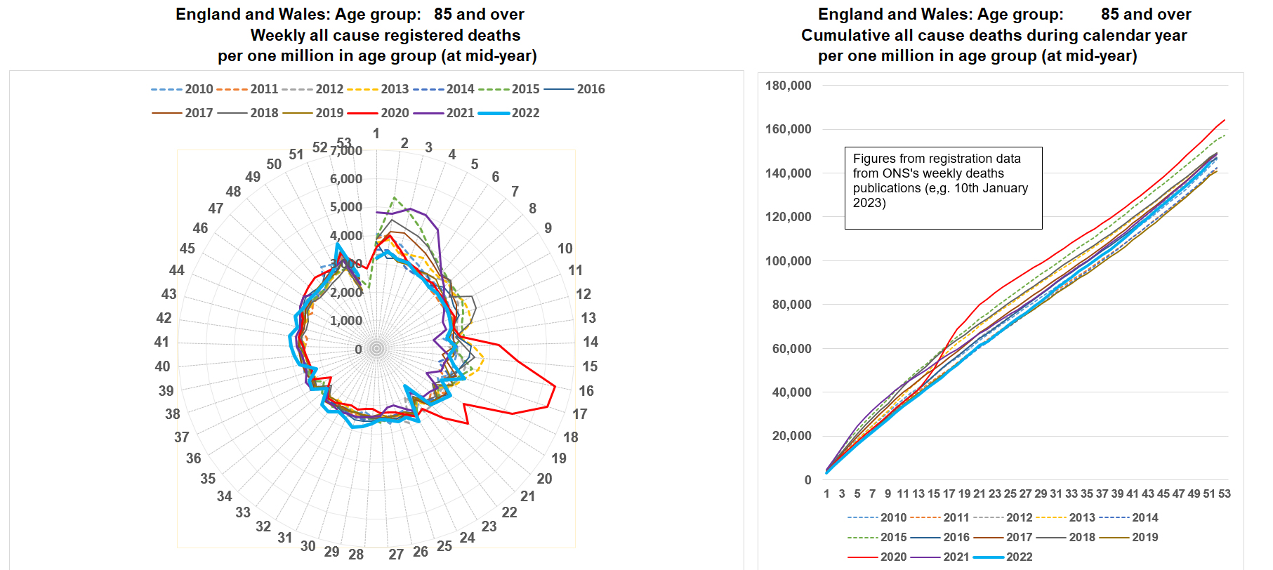 I agree with your point but we need to understand what baseline the excess is measured against. ONS provide a simplified baseline (so journalists don’t get confused) based on 5 year averages. This has worked reasonably well in the past but fails badly when we get unusually high (or low) mortality in a year. 2019 was an unusually low year. As soon as we include it in a 5-year average it magnifies anything we compare against it. ONS have made an attempt to exclude 2020 from the averages because it was unusually high but have included 2019 even though it was unusually low. In my opinion, the only credible baseline to compare against is the recent trend(s) – say, over the last decade. If we compare 2019-2022 with the 2011-2018 trend we find that the peak in 2020 is almost balanced out by the trough in 2019. We had built up a subset of the population which we might have expected to die before the damn bug surfaced. (The trend in ASMR prior to 2011 would reach zero deaths in England in 2047 and in Wales in 2050. Clearly, it could not continue). If the vaccines were so deadly that… Read more »