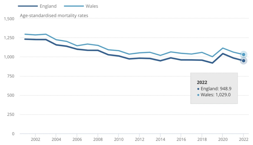 The population-weighted age-standardised mortality rate in England and Wales was 953 per 100,000. While this was higher than in 2019, it was lower than in 2021, 2020, 2018, 2017, 2016, 2015, 2013 and every year before that. In other words, 2022 was the third least-deadly year ever.