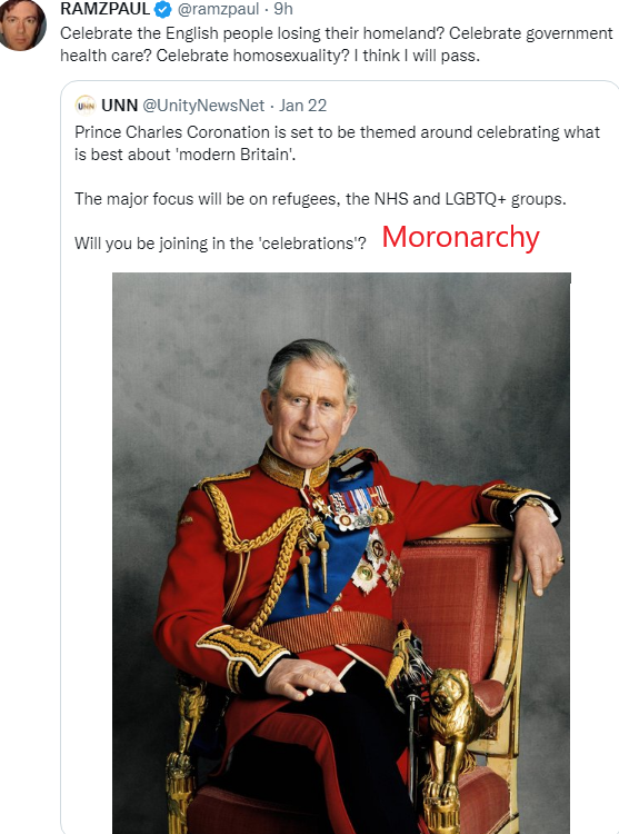 And the monarchy isn’t just not doing anything to stop it, not even just standing by watching doing nothing, they’re leading the bloody charge. So they are of less than no use to me. They are a menace to my freedom.