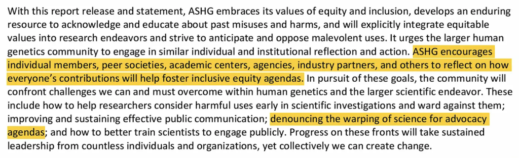 And the sentence I highlighted is far from the only place where the authors take an openly political stance. They begin by noting that ASHG has been “late in making explicit efforts to integrate equity, diversity, and inclusion into its values, programs, and voice”. And they further note that ASHG will continue “its recent actions to prioritise diversity, equity and inclusion”.