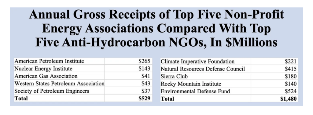 Second, despite numerous claims about how nefarious actors are blocking the much-hyped “energy transition”, the size of Climate Imperative’s budget provides more evidence that the NGO-corporate-industrial-climate complex has far more money than the pro-hydrocarbon and pro-nuclear groups. Indeed, the anti-hydrocarbon NGOs (most of which are also stridently anti-nuclear) have loads of money, media backing, and momentum. As can be seen in the graphic below, the five biggest anti-hydrocarbon NGOs are now collecting about $1.5 billion per year from their donors. (All data is from Guidestar.) That sum is roughly three times more than the amount being collected by the top five non-profit associations that are either pro-hydrocarbon or pro-nuclear.