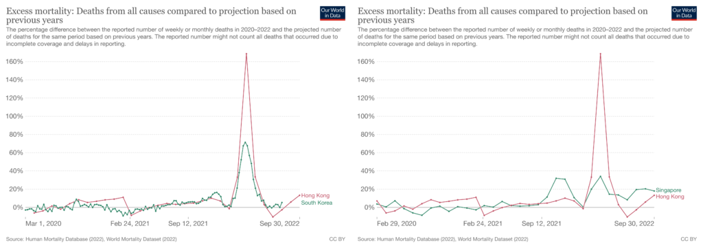 Which, in turn, almost certainly explains why Hong Kong saw a much greater spike in excess mortality than South Korea, as shown in the left-hand chart below.