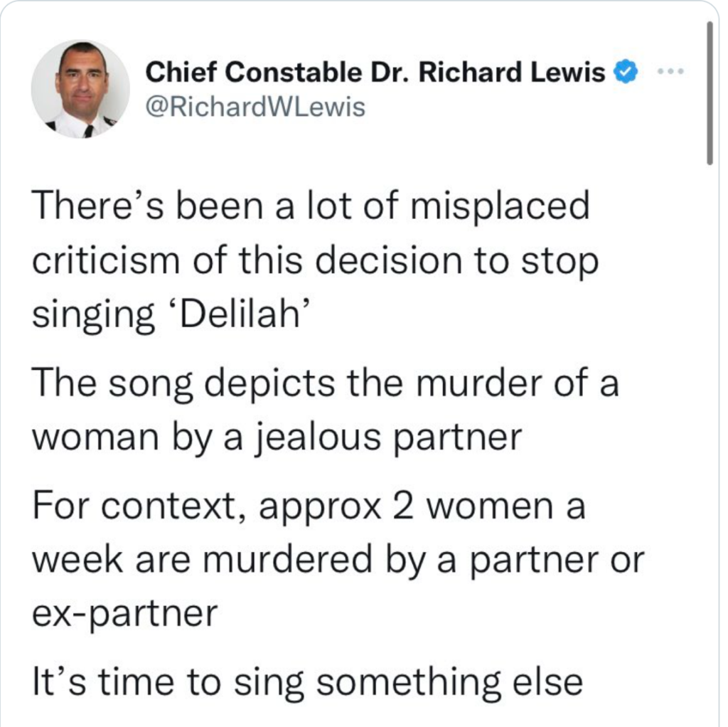For context, the chief constable should probably stop looking at banning popular songs and instead look at ways to regain the trust of women in the police! There have been too many reported cases of women suffering abuse and harm from some serving members of the police force.