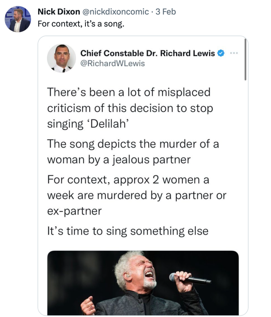 One has to appreciate this logic: Because people do get murdered by jealous partners, the chief constable of Dyfed-Powys Police tries to order people he has no authority over to stop singing songs about this topic: Some people commit crimes. Therefore I – chief-constable Dr Richard Lews – demand other people must not sing songs I disapprove of!