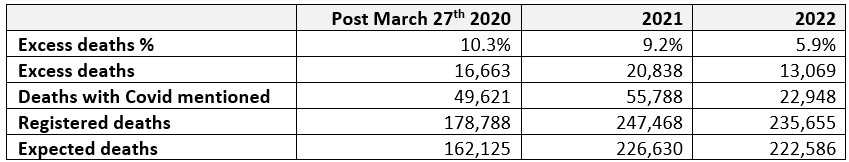 One of the oddities of the data is that deaths with Covid are so much higher than excess deaths. In 2020 there were three times more Covid deaths than excess deaths. In 2021 there were 2.7 times more Covid deaths than excess deaths and in 2022 the figure was 1.75 times greater. Can it be true that in the absence of Covid we would have had so many fewer deaths than normal?