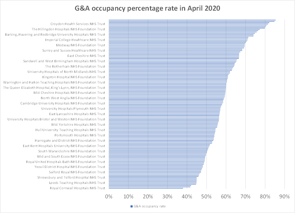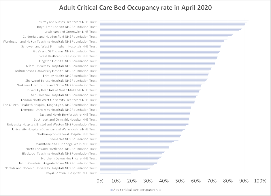 Figure 2 shows two charts. The top one shows the percentage of the average General and Acute (G&A) hospital bed occupancy by NHS trusts during April 2020. The lower one shows average critical care bed occupancy during April 2020. Due to space I’ve only named every fifth NHS trust but if you want to look at the data for your local trust you can find them here.