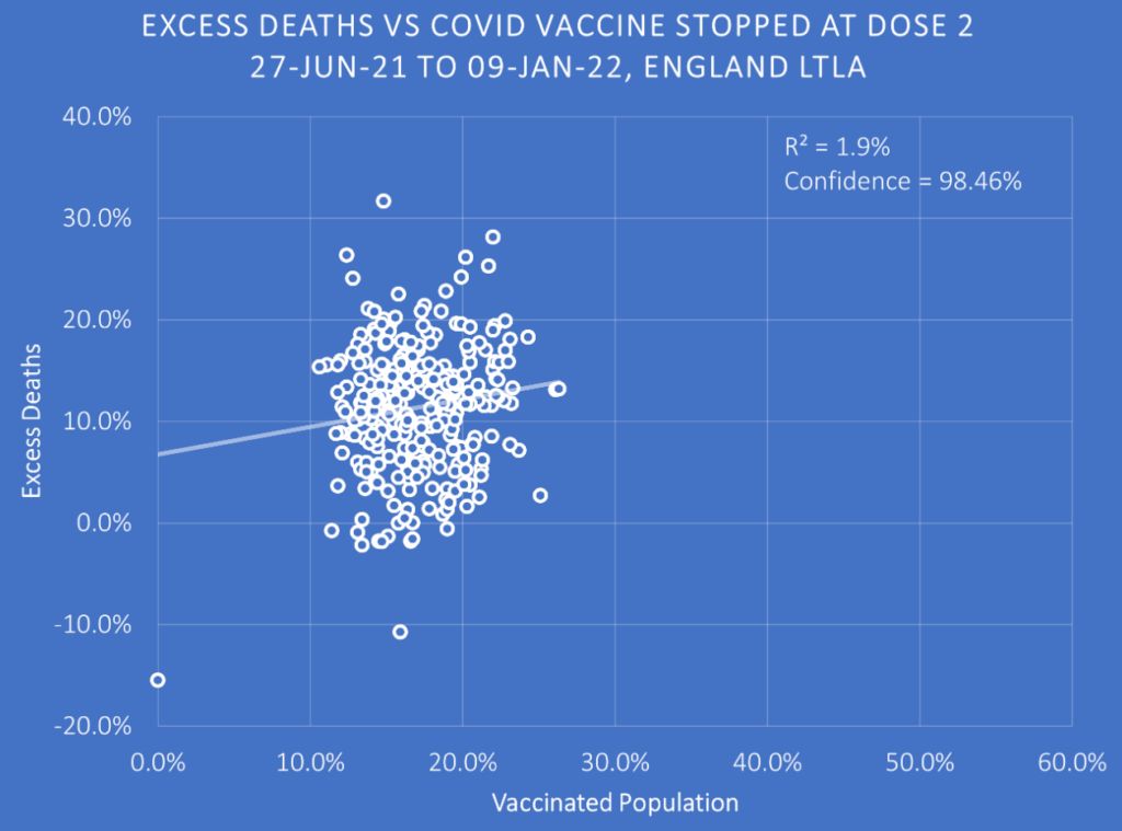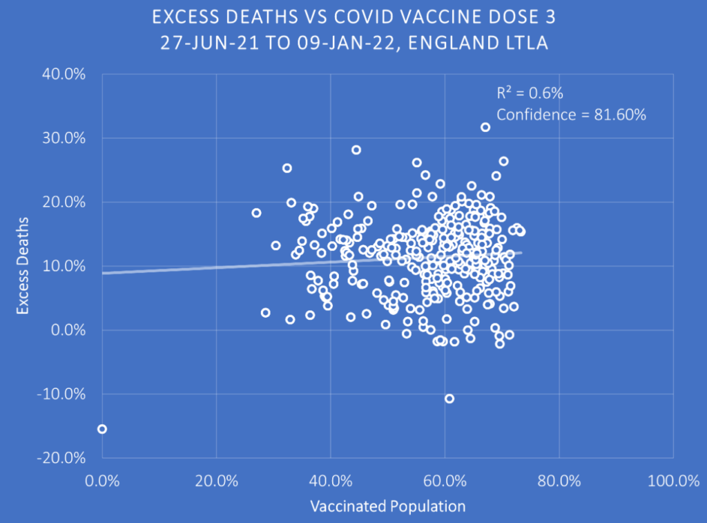 I’m sorry, but I think you’re missing the point. There is a reason Will has shown the these two graphs side by side, they should be looked at together. The left-hand graph shows the relationship between ‘vaccine’ up-take and excess deaths during 2020 before anyone had been injected. Therefore, there is a common factor or factors between vaccine up-take and excess deaths during 2020. Will suggests that it is the wealth of inhabitants of the local authorities. Now, if everyone was injected with a placebo, you would expect a similar graph on the right to the one the left. However, if the injections had done what we have been told was the intention and saved lives, the graph on the right should be a steeper downward sloping line with a higher R squared value. I would add that as the period covered is post a period of high excess deaths, most of the plots should be below 0% excess deaths. Instead what we have is an upward sloping line. Note, that given the confounding factor or factors revealed by the first graph, there could never be a strong upward relationship. That there is any relationship at all in the ‘wrong’… Read more »