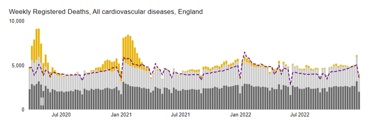 This is an odd hypothesis because there were no non-Covid excess cardiovascular deaths following Covid in England in 2020 (grey bars above purple line). But it’s a popular hypothesis so let’s go along with it.