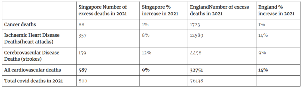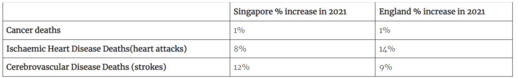 Given the low numbers of infections with Covid in Singapore in 2020 and the fact that there was little Covid prior to September 2021, it is hard to reconcile that conclusion with this substantial increase in cardiovascular deaths.