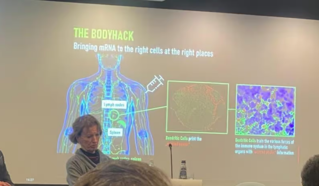 But look at the below picture from a recent presentation on mRNA vaccination at the European Parliament. The picture was posted on Twitter by Virginie Joron, a French member of the Parliament. The speaker is no less an authority than Özlem Türeci, the Chief Medical Officer of BioNTech, the German biotech company that developed what has come to be known to most of the world as the ‘Pfizer’ COVID-19 vaccine.