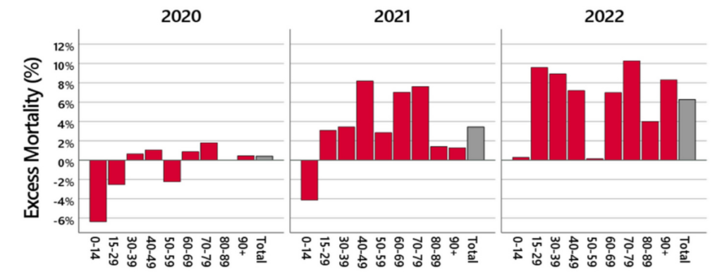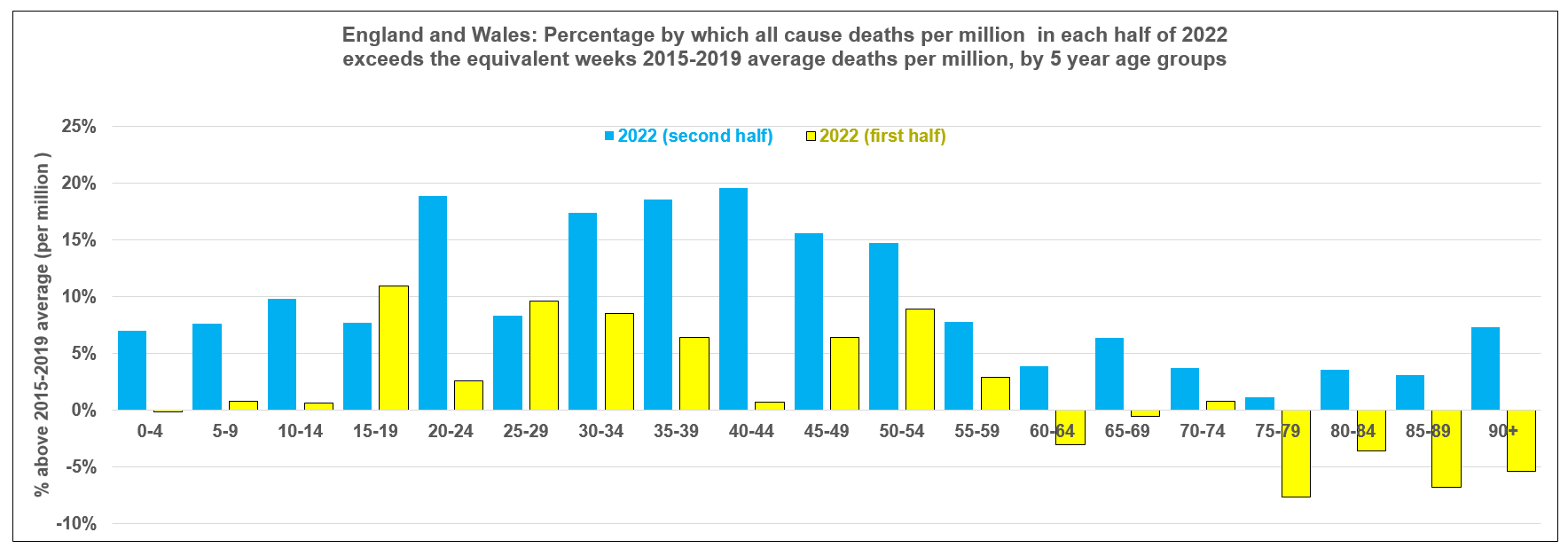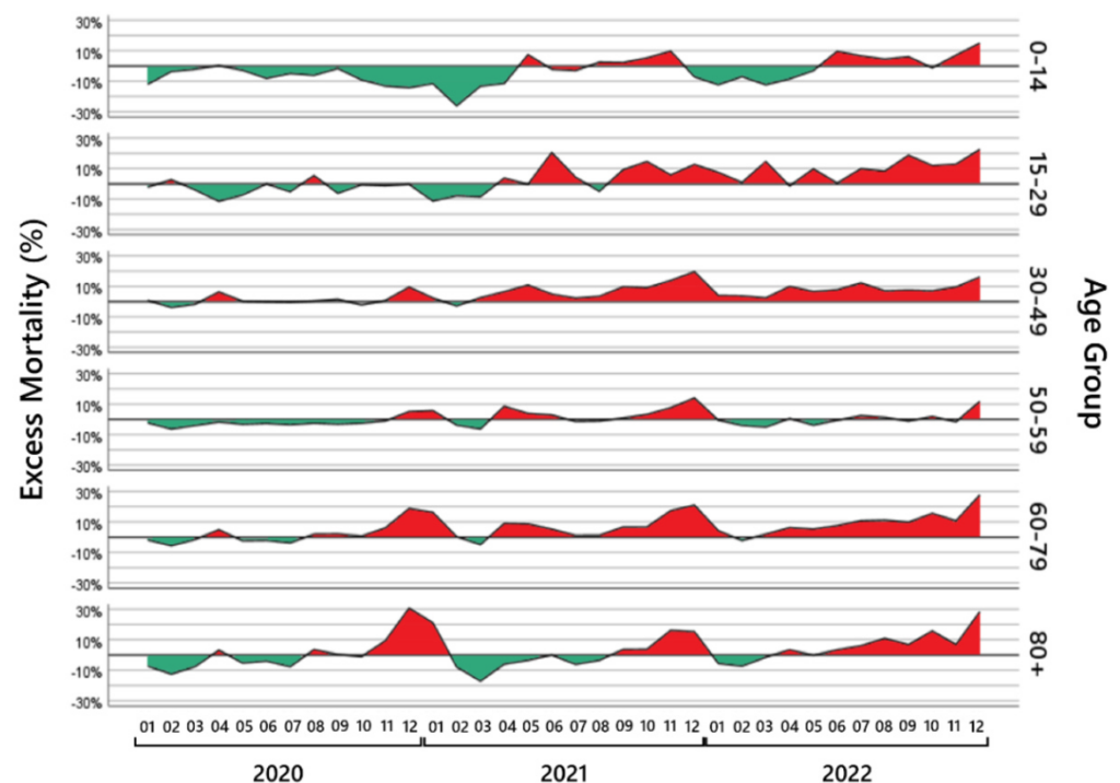 Note excess mortality in every age group for the second half of 2022 (the blue bars are all positive). If you look at the lines on the first chart you can see how this that excess has occurred over those 6 months.
