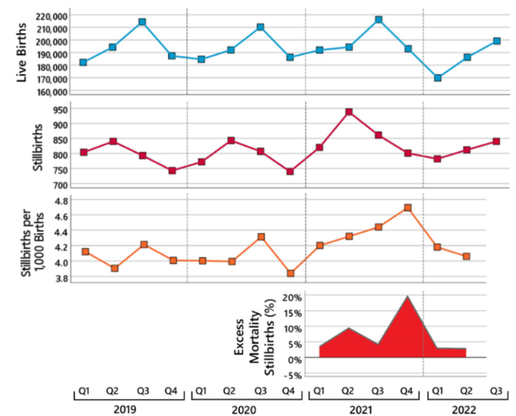 In summary, the following picture emerges: From the beginning of April 2021 onwards – the start of the vaccination campaign – excess mortality suddenly increases continuously up to the youngest age groups and is no longer compensated by phases of a mortality deficit. That is, unlike before, the observed excess mortality no longer represents a pull-forward effect where the highly vulnerable people die some months earlier than expected. In addition, the number of stillbirths is increasing at the same time. Nine months later, a massive and sustained decrease in live births is observed.