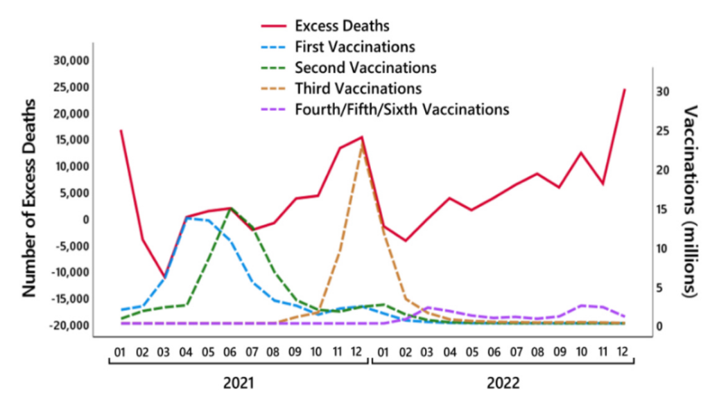 Excess mortality is increasing in parallel with the increase in the number of first vaccinations. Exactly as the number of first vaccinations decreases, excess mortality also begins to decrease, but not as much as the first vaccinations, perhaps because the number of second vaccinations increases at the same time. And exactly with the peak of the second vaccinations, excess mortality also reaches its peak, only to then decrease exactly parallel to the second vaccinations. With the start of the third vaccinations, there is a parallel increase in excess mortality, and exactly as the third vaccinations decrease, the excess mortality also decreases.
