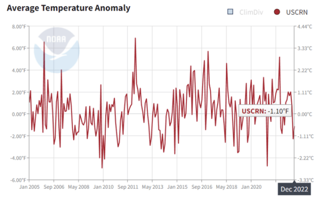 In fact, NOAA does make a serious attempt to track U.S. temperatures away from any urban or human corruptions. A rarely-publicised database is compiled from 114 nationwide stations designed to provide continuous recordings well away from any urban heat distortions. The measurements started in 2005, and to date show little if any warming. It is called the US Climate Refence Network, and the latest graph is posted below.