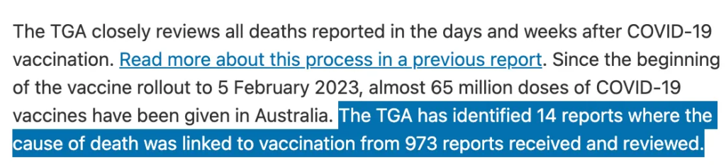 Australians have been falsely and misleadingly advised by the TGA and official health representatives that out of 973 reported deaths, only 14 have been assessed as being causally linked to the Covid vaccines (13 following Astra Zeneca, one following Moderna).