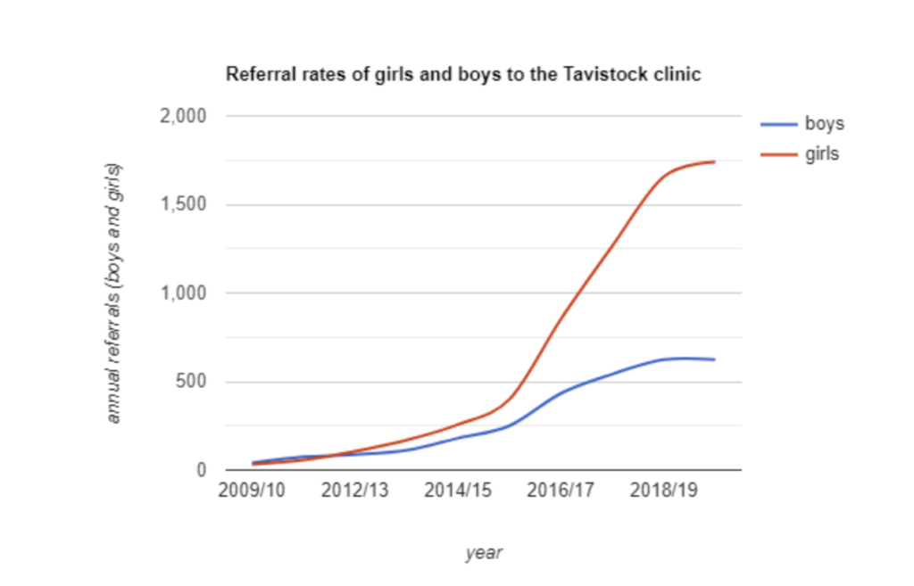 So, attributing the rising number of young people identifying as transgender to social factors – as the respected medical researcher Dr. Lisa Littman has done (see this peer-reviewed paper, for instance) – is disinformation? I wonder if the researchers at the GDI, who’ve presumably carried out an exhaustive review of the research literature on gender dysphoria, can explain why the rise in teenage girls identifying as transgender is so much higher than the rise in teenage boys? After all, if gender dysphoria is “a naturally occurring state”, why does it disproportionately affect women? This can be seen in referrals to the Tavistock clinic between 2009/10 and 2018/19. According to data collected by Transgender Trend: “In less than a decade there has been a 1,460% increase in referrals of boys and a staggering 5,337% increase in girls.”