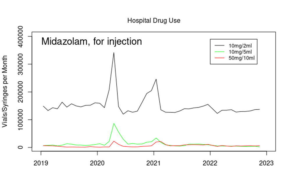 These data show that even in normal times hospitals use far more midazolam than GPs – compare the GPs 20,000 prescriptions per month with the near 150,000 vials per month just for the 10mg/2ml vials of midazolam. Note that they have good cause to use this drug – it is often used before surgery and other medical procedures to induce sleepiness and reduce anxiety at a time when the patient is probably, and quite reasonably, apprehensive about an upcoming procedure. NHS hospitals perform around a million surgical procedures per month, so the baseline use, while seemingly high, is in proportion to the medical need.