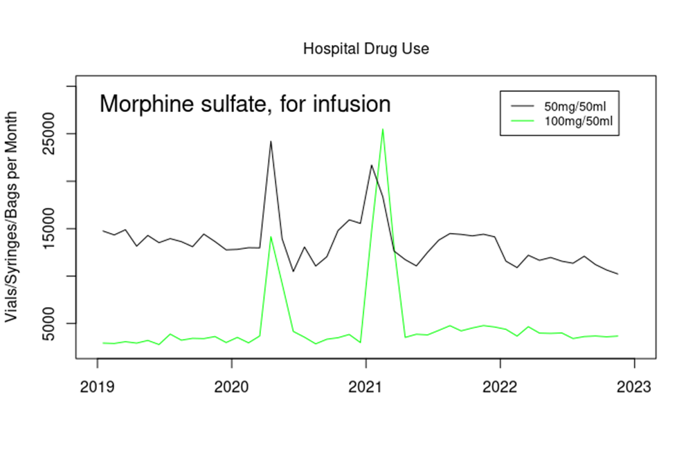 Note that morphine is also used in vials of 100mg/100ml and 250mg/250ml – these preparations are often used within hospitals but didn’t show a significant increase over this time period.