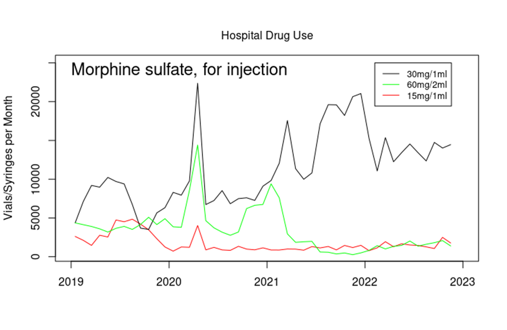 Note that by far the most commonly used form of morphine is in vials of 10mg/1ml – at around 250,000 vials used per month this is far in excess of the quantities shown in the graph above. However, there appears to have been no similar increase in use of this preparation of morphine over the time period in question.