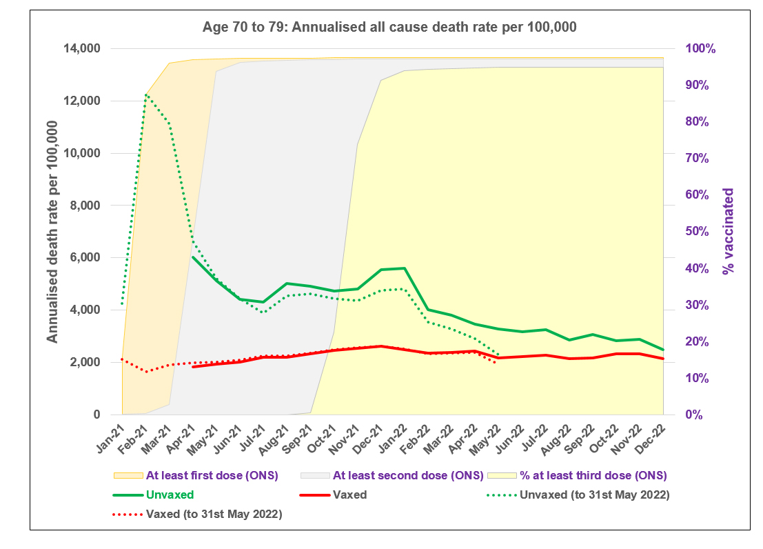 The next thing to note is the drop in the non-Covid death rate in the unvaccinated in the first half of 2022, by around 30%. Why do the unvaccinated became much less likely to die over this short period? It is not explained and I have no suggestions either, but such a huge improvement in the health of a cohort does need some kind of account; it is presumably an artefact of some kind. Responding to queries on Twitter, Dr. Caul simply stated that: “More research would be needed, [it] could be based on the characteristics of those likely to be vaccinated/unvaccinated.” After June the non-Covid death rates for vaccinated and unvaccinated become similar, but the reason they have converged – due to the vaccinated rate increasing and the unvaccinated rate mysteriously decreasing – remains under-explored.